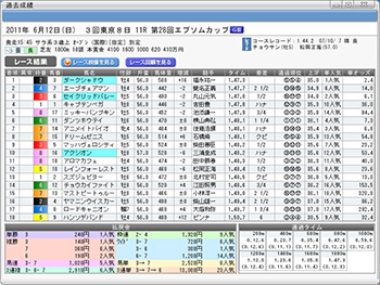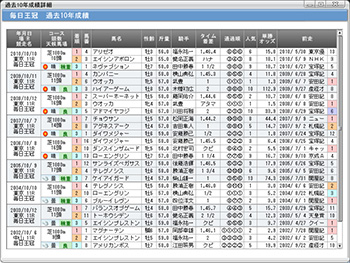 [画面6]過去10年の1〜3着馬の馬名や前走などが表示される。最新バージョンでは、ここにコーナー通過順表示が追加された。各年のより詳しい成績は表の左側のレース名をクリックして閲覧できる。