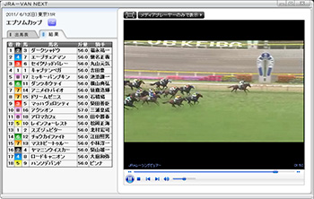 まず、環境設定の[JRAレーシングビュアー連携]欄で「連動機能を使用する」にチェックを入れた上、「出馬表も一緒に表示する」もチェックしておく(画面1)。レース映像再生の方法は何種類かあるが、出馬表でレース検討中に過去のレースを見る場合は、見たいレースをクリック(画面2)。過去成績画面が表示されるので(画面3)、画面左上の[レース映像を見る]ボタンをクリックする。すると、従来はメディアプレイヤーが起動していたが、上記設定を行っているとNEXTの子画面にレース結果(タブ切り替えで出馬表)とレース映像が並んで表示されるようになる(画面4)。ここで[メディアプレイヤーのみで表示]ボタンを押せば従来の形式でも再生できるほか、最初の環境設定を元に戻せば、常にメディアプレイヤーで再生することも可能。自分好みの方法を選択するといいだろう。