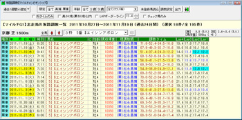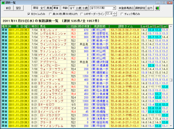 画面5は11月23日の坂路調教一覧を表示した例。上のボタンで栗東に限定し、さらにチェックボックスで「好タイムのみ」を指定している。調教は時刻順にソートされており、画面を下にスクロールすると、この日は8:02の後が8:21。恐らくこの間の約20分が、インタビューにもあったハロー掛けの時間と推測される。ハロー掛け以前は800m53秒台まで、ハロー掛け後には京阪杯に出走するロードカナロアが51秒7を計時していることがわかる。この画面は、項目名をクリックすれば馬名や調教タイム順、チェック印などでもソート可能だ。また、「好タイムの」定義は[オプション]-[環境設定]-[坂路調教]や、画面3の[好タイムの定義]で変更可能できる。