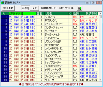 [画面4]主に重賞出走予定馬について提供されている調教映像リスト。調教映像をまとめて見たい場合には便利だ。日付をダブルクリックで再生できる。情報が古い場合は[リスト更新]ボタンをクリック。