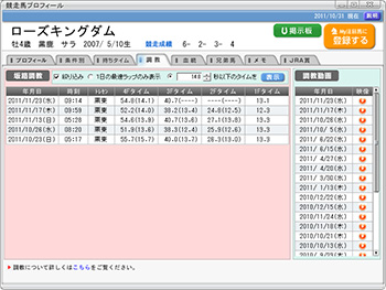辻さんがおっしゃっていた履歴は、競走馬プロフィール画面から[調教]タブで表示できる。画面7はジャパンC出走のローズキングダムについて表示した例。直近の坂路調教タイムが表示されており、画面上部ではラスト1ハロンタイムなどで絞り込みが行える。そして、画面右にあるのが、この馬の調教映像の履歴。ローズキングダムの場合は09年の11月18日、デビュー2戦目の東京スポーツ杯2歳Sの追い切りまでさかのぼって再生できた(画面8)。インタビューで例に挙がったオルフェーヴルなら、デビュー前の10年7月22日や8月11日の映像も再生できる。映像は主に新馬と重賞出走馬を中心に提供されているため、2歳のうちから重賞路線で活躍している馬ほど、より古くからの映像を多く視聴可能だ。