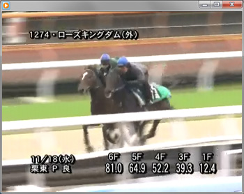 [画面8]ジャパンCに出走するローズキングダムの場合は、デビュー2戦目・東京スポーツ杯2歳Sの追い切りの様子も見ることが可能だ。皐月賞あたりからは坂路中心のローズキングダムだが、当時は栗東Pコースでの追い切りだった。