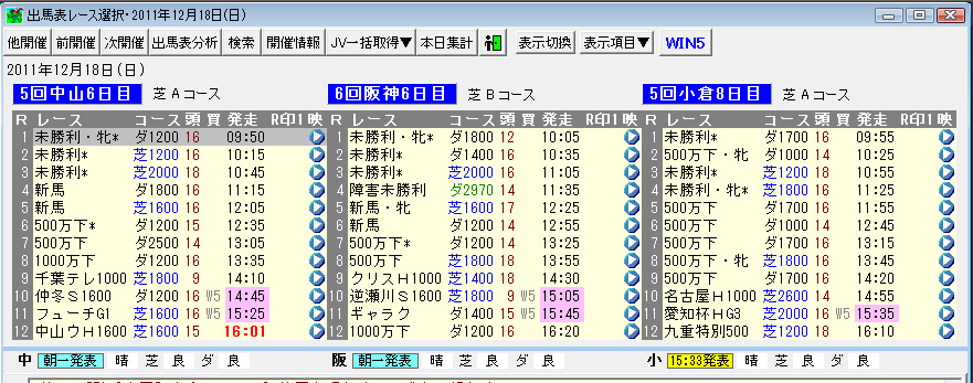 【画面2】ターゲットの[出馬表レース選択]画面。WIN5発売対象日に画面右上にある[WIN5]ボタンをクリックすると、WIN5の投票画面が開く。対象日以外でも「シミュレーションモード」で仮想配当などは確認できる。