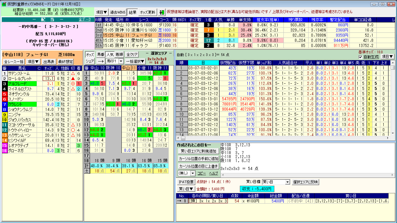 WIN5の投票は通常の出馬表から買い目を入力する手順ではなく、専用の投票画面を開いて行う。まず、WIN5発売対象日の[出馬表レース選択]画面を開き、画面右上に表示される[WIN5]ボタンをクリック(画面2)。すると、[仮想5重賞オッズ(WIN5モード)]という画面が開く(画面3)。画面中央やや左にある、各レース出走馬の馬番と単勝オッズが表示されている「選択エリア」から、それぞれのレースで投票したい馬の単勝オッズをクリックしてゆく。すると、画面右側に選択した馬を組み合わせた買い目の一覧が表示され、画面右中央には買い目の点数も表示される。問題がなければ[買い目エリアに新規追加]をクリックし、金額を設定した上で[IPAT投票]ボタンをクリックすれば、投票が可能だ。画面3は全レースが確定している状態のものだが、レース前や進行中なら画面上部の[オッズ更新]ボタンを押せば、最新のオッズや結果、残り票数などが表示されていく。