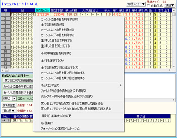 また、仮想配当や平均人気などの項目名をクリックすれば、その項目の内容で並べ替えることもできる。たとえば「仮想配当50万馬券未満は買わない」と決めれば、[仮想配当]をクリックしてソートを行い、50万馬券近辺の目を右クリックして[カーソル以上の目を削除する]を選択したり、それで購入を決めるなら[カーソル以下の目を買い目に追加する]をクリックすれば良い。