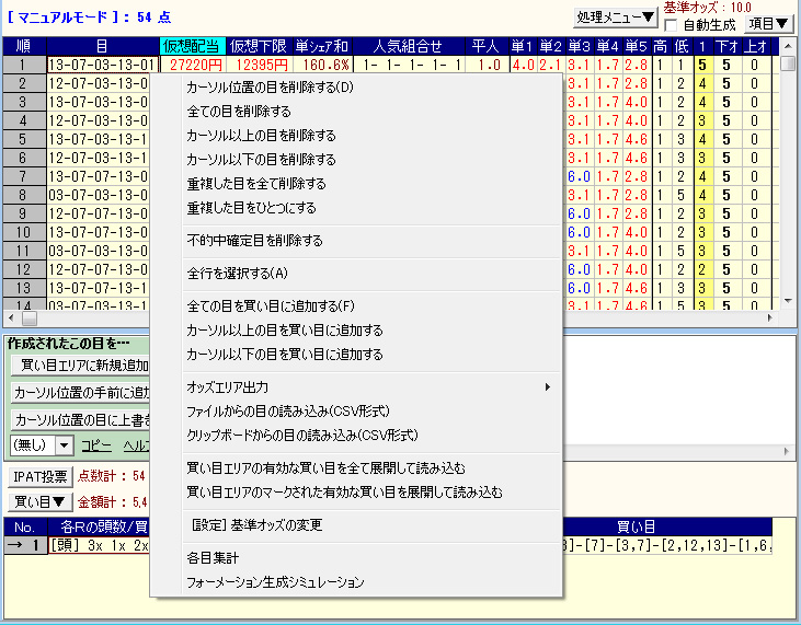 【画面4】[自動生成]のチェックを外し「マニュアルモード」に切り替えると、特定の買い目を削除したり、仮想配当などの項目でソートした上で、カーソル以上(以下)の目をまとめて削除することも可能になる。