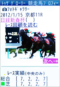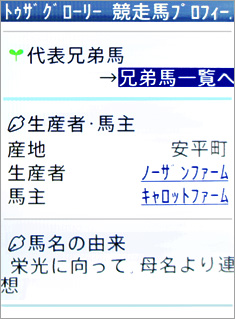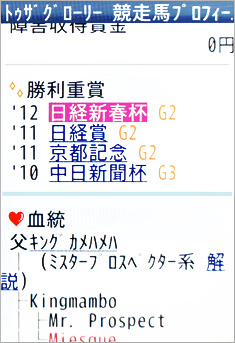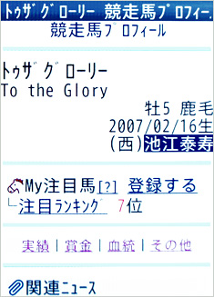 [画面1]ケータイサービスの「競走馬プロフィール」画面、トゥザグローリーの例。ケータイサービスを利用すれば、外出中などでも知りたい情報をその場ですぐに確認することが可能だ。