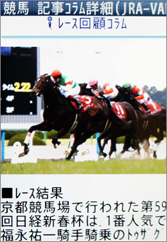 「競走馬プロフィール」画面を下にスクロールしていくと、今度は「フォトギャラリー」が表示される。これも重賞を勝つなどの活躍をしている馬について表示されるコンテンツだ(画面3)。ここで[次へ→]を選択すると、トゥザグローリーの場合は昨年の日経賞の写真が表示される。また、レース名[日経新春杯]を選択すればレース結果を(画面4)、[レース回顧を読む]を選択すればレース回顧を(画面5)閲覧できる。
