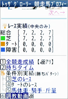 松本さんは、主にJRA-VANのケータイサービスを利用されているとのこと。インタビューにもあったように、コースで調教を見ているようなときでも、その馬の出走履歴などさまざまな情報を確認できるのがケータイサービスの特徴だ。これまでもこのコーナーでは何度かケータイサービスを紹介しているが、今回は「競走馬プロフィール」画面から見られる情報について、改めてまとめて紹介したい。