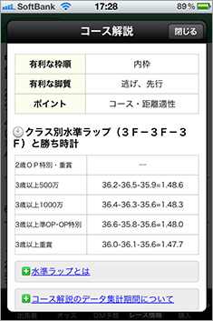 iPhoneアプリでは各レースの「レース情報」の最上部、発走時刻や条件などが表示されている部分に、コース図とともにコース解説へのリンクも掲載されている(画面1)。解説はJRA-VAN NEXTや、DataLab.で提供されているものと同様で、そのコースの概要や、どんな展開になりやすいか、そして枠順による差などについて(画面2)。そして最後には、有利な脚質や枠順、ポイント、クラスごとの水準ラップと勝ち時計もまとめられている(画面3)。いずれも、レース予想する前に把握しておきたい情報ばかりだ。