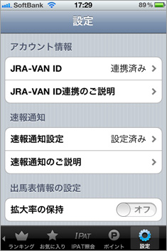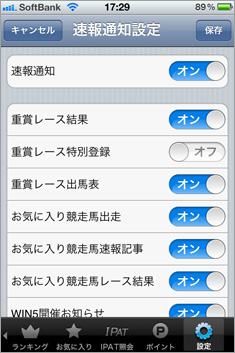 まず、画面下の[設定]アイコンから、設定画面を開く(画面4)。JRA-VAN IDとの連携や、JRA-VAN iPhoneアプリの設定などいくつかの項目があるが、通知に関する設定は[速報通知設定]で行う。設定画面を表示し、通知したい項目を「オン」にしていけば、その項目に関する情報が自動的に通知されるようになる(画面5)。岡村さんのように、「お気に入り」に登録した馬の出走情報を知りたければ「お気に入り競走馬出走」を「オン」にすれば良い。