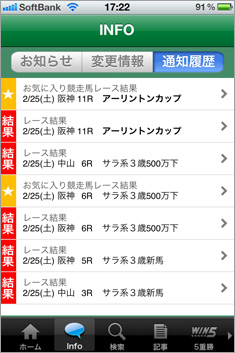 [画面6]画面5で設定した内容の通知履歴は[info]-[通知履歴]で確認できる。「お気に入り」競走馬に関する通知なら、レース名などとともに「お気に入り競走馬○○○(通知内容)」と表示される。