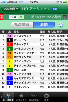 [画面7]画面6の通知履歴でレース結果をタップすると、そのレースの結果が表示される。通知設定によってはお気に入り競走馬に関するニュースなども、同様の手順で通知、表示が可能だ。