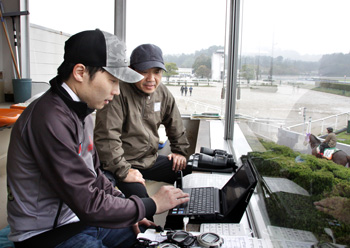 井内:タップダンスシチーが人気になっていた有馬記念のとき、「競馬予想TV!」で佐々木晶三調教師にインタビューをできないか、というお話しがあって、トラックマンの方を通じて先生を紹介していただいたのが、たいへん大きかったですね。それまでは、今とは違う場所で一人ポツンと座って調教を見ていたのですが、そのインタビューのあとで「これからここで(調教を)見ていいですか」とうかがったら「いいよ、いいよ」と。