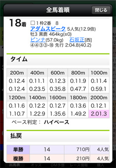 【画面2】画面1を下にスクロールすると、1ハロンごとのタイムや、積算タイム、ペースを知ることができる。こういった情報と動画を併せてレースを振り返れば、より詳細にレースを分析できるだろう。