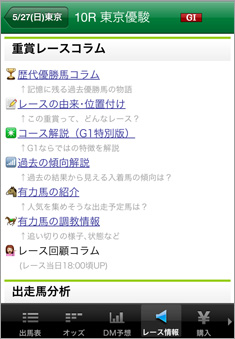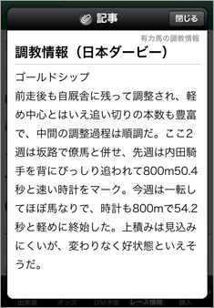 【画面6】画面5の「調教情報」の記事は、「レース情報」から[有力馬の調教情報]で表示できる。この「レース情報」では、コース解説や、有力馬の紹介記事なども閲覧可能だ。