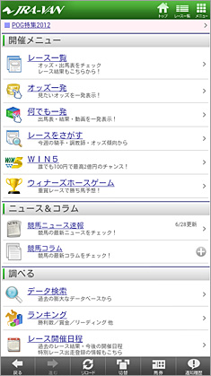 【画面1】その週に行われる競馬のさまざまな情報は「開催メニュー」にまとめられている。ジョッキーごとの騎乗馬一覧を検索する場合は[レースを探す]から。