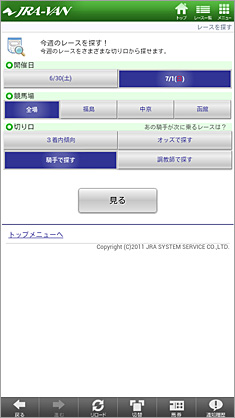 検索の「切り口」は4種類が用意されており、騎手の場合は開催日や競馬場を選んだ上で[騎手で探す]を選択して[見る]をタップする(画面2)。画面3は7月1日の全場を指定して表示した例で、画面下部に石橋脩騎手の名前も見られる。ここで、情報を見たい騎手を選択すると、その騎手の騎乗馬一覧が表示される(画面4)。さらに、ここから各馬の情報を参照することも可能だ。