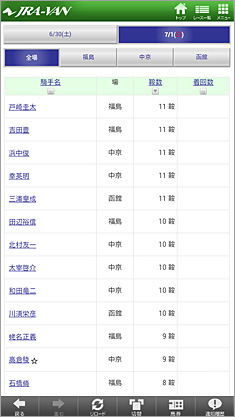 【画面3】画面2で指定した7月1日、全場の騎手ごとの騎乗数が表示される。ここで情報を見たい騎手を選択する。開催日や競馬場は、この画面でも切り替えられる。