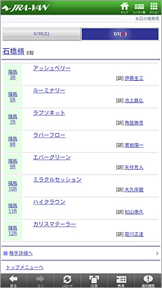 【画面4】画面3で石橋騎手を選択した例で、当日の騎乗馬一覧が表示されている。ここからさらに、それぞれのレースや馬の情報を見ることも可能だ。