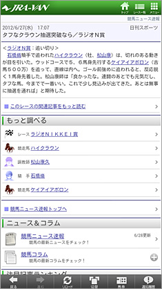 ほかに、石橋さんはレースや調教動画、そして競馬ニュースなども閲覧されているとのことである。ここではもうひとつ、競馬ニュースについて紹介したい。画面4などを表示しており、ニュースを読みたい馬が決まっている場合は、「競走馬プロフィール」から、その馬に関するニュースを表示できる。画面5は、先の画面4にあった石橋脩騎手の騎乗馬一覧から、福島11レース(ラジオNIKKEI賞)で騎乗するハイクラウンの「競走馬プロフィール」を表示した例。ニュースがある場合は画面に「最新ニュース」が表示され、ここから内容を読むことが可能だ(画面6)。