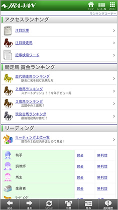 【画面1】「ランキングコーナー」では、騎手、調教師リーディングなどさまざまな情報を得られる。