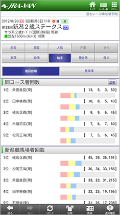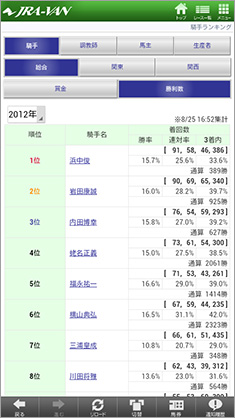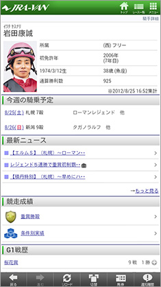 岡部さんに挙げていただいた活用例の中では、たとえばリーディング情報については騎手、調教師、馬主、生産者など、「ランキングコーナー」にさまざまなメニューが用意されている(画面1)。画面2は騎手のリーディング情報(全国、勝利数)を表示した例。画面右上には「8/25 16:52集計」と出ているが、8月25日は土曜日。最新の結果をもとに、日曜のレースを予想することが可能だ。また、この騎手ランキング画面上部から、他のリーディング情報に切り替えたり、騎手名からは選択した騎手の詳細情報を表示することも可能である(画面3)。