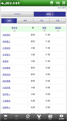 【画面4】こちらは「開催メニュー」から「本日の騎手」を表示した例。騎手ごとに騎乗する競馬場や騎乗数が表示される。