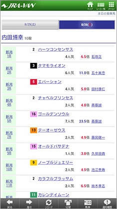 【画面5】画面4から、8月26日の内田博幸騎手の騎乗馬一覧を表示したもの。ここからさらに、レース情報や騎乗馬の情報も表示可能だ。
