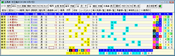 【画面5】[出目]タブを表示した例で、画面中央から右にかけては連対枠番、馬番がレースごとに表示されている。また、画面下の部分からは枠番、馬番ごとの連対数も知ることができる。
