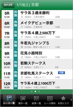さて、今回はそのiPhoneアプリからもうひとつ浜中さんのお話しにあった、枠順確定前の出走馬情報や、騎手について紹介したい。iPhoneアプリでは、金曜、土曜に翌日の枠順確定後、その情報を見ることができるが、それ以前の木曜夕方の段階から、枠順確定前の出馬表も提供されている。枠順確定前は、各開催日、開催場の「レース一覧」画面で、レース番号の後に[枠無]と表示される(画面1)。