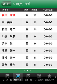 【画面3】画面1[レース一覧]の下部から、[騎手一覧]を表示した例。その日の騎乗騎手一覧が表示される。