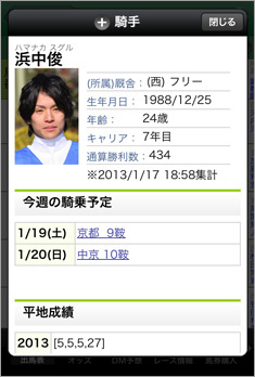 【画面4】画面3から浜中騎手の情報を表示したもの。その週の騎乗馬を見る場合は、画面中央にある「今週の騎乗予定」欄から、表示したい日のリンクをタップする。