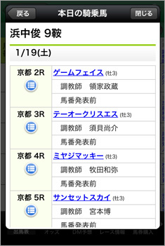 【画面5】浜中騎手の1月19日の騎乗馬一覧画面。馬名から騎乗馬の情報を表示したり、レース番号下のアイコンからはそのレースの出馬表も表示できる。