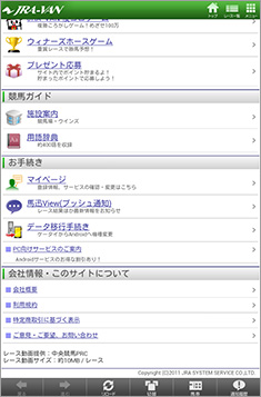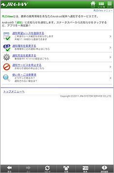 【画面1】「JRA-VAN 競馬情報 for Android」のトップ画面下部。「馬迅View」による通知は「お手続き」欄の[馬迅View(プッシュ通知)]から設定を行う。