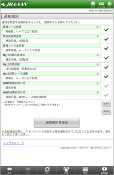 【画面3】画面2で[通知種別を変更する]を選択した例。重賞のレース結果や、「My注目馬」に登録した馬のレース結果などを通知できる。通知したい項目をチェックし、[通知種別を登録]をタップすれば、指定した情報が通知されるようになる。