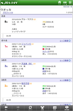 過去レースであれば、「開催メニュー」の[レース一覧]や、「調べる」-[データ検索]などから、見たいレースを指定して再生することも可能だが、安田さんのように「過去の名馬のレース映像を見たい」といった場合は、競走馬の「競走成績一覧」画面から視聴するのが便利だ。画面4はウオッカの「競走成績一覧」を表示した例で、「前々走」「3走前」などの欄の右にあるレース動画アイコンをタップすればその動画が再生される。