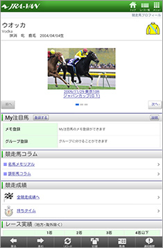 【画面5】一部の馬についてはコラム「名馬メモリアル」が掲載されており、該当馬は「競走馬プロフィール」画面にリンクが表示される。
