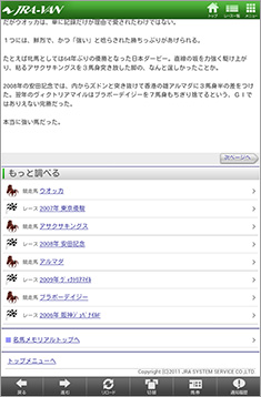【画面7】画面7の下部にある「もっと調べる」欄からは、そのページで名前が挙った競走馬やレースについて、より詳しい情報を表示できる。見たことのないレース、もう一度見たいレースがあれば、ここからレース結果画面を経て動画の再生が可能だ。