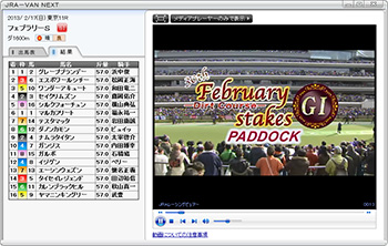 【画面6】フェブラリーSのパドック動画。動画表示部分の上のボタンからは、拡大表示やメディアプレーヤーでの再生に切り替えられる。動画再生時にこの出馬表(または結果)つきのウインドウを表示するか、直接メディアプレーヤーで再生するかは、JRA-VAN NEXTの[設定]で切り替えることが可能だ。