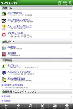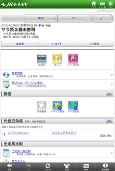 [画面1]「レースメニュー」画面。レース結果の確認は通常、レース確定後に[レース結果]アイコンをタップする。