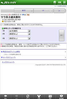 [画面2]画面1でレース確定前に[レース結果]アイコンをタップした例。まだ確定していないというメッセージが表示されるが、その下のプルダウンメニューで1〜3着馬を入力できる。