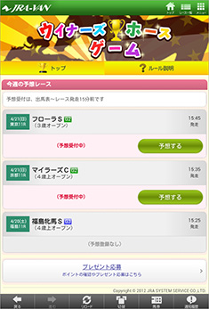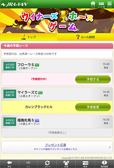 [画面4]「ウィナーズホースゲーム」の参加はトップ画面の「お楽しみ」コーナーから。