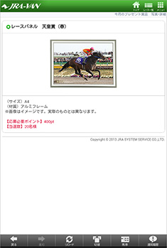 ポイントの確認やプレゼントの応募は、画面4の[プレゼント応募]や、画面5、7下部にある[プレゼント応募]から行う。画面8はプレゼントのひとつ、レースパネルを表示したもので、応募に必要なポイントは400ポイント。先に触れたように複数口の応募が可能で、800ポイント持っていれば2口応募することができる。なお、プレゼントの応募はひと月に1賞品。また、「ウィナーズホースゲーム」のほかに「複コロゲーム」でも、精算時の「VANdaコイン」の10%が「プレゼント応募ポイント」として加算される。詳しくはAndroidアプリ「複コロゲーム」のコーナーをご覧いただきたい。