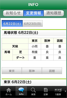 【画面1】当日の変更情報を表示した例。各競馬場の天候や馬場状態、そして出走取消や騎手変更などの情報が確認できる。