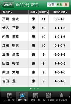 そのひとつが「騎手一覧」で、画面4は6月22日、東京競馬場の騎手成績をメインレース前の段階で表示したものだ。この画面を見れば、その日好調の騎手をすぐに知ることができる。