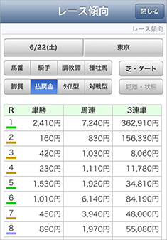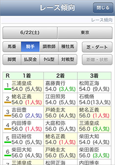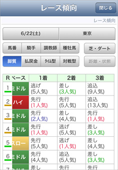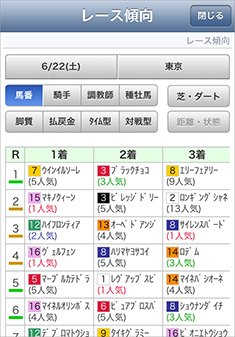 また、各レースの1〜3着馬についてさまざまなデータを表示できる「レース傾向」も非常に便利だ。画面5は、画面4の下にある「レース傾向」のアイコンから「馬番」を表示した例で、上位馬の馬番、馬名、そして人気順が表示されている。レース番号下のバーが芝・ダート別に色分けされており、コースごとに内外の有利・不利が出ているのかチェックできる。