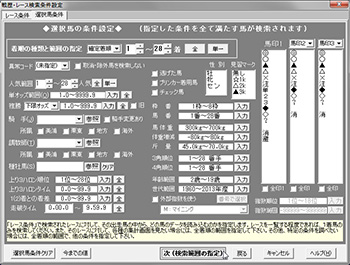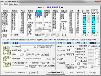 すると「戦歴・レース検索条件設定」ウインドウが開く(画面2)。ここでは競馬場やクラス、馬場状態など、さまざまな条件から絞り込みが行えるが、今回は過去1年の平地競走全レースを対象として調べるため、画面2では「コース」欄の[芝][ダート]のみを選択し、画面下の[次(選択馬の条件)]をクリックする。「コース」欄でなにも選択しない場合は、障害も含めた全レースが対象となる。