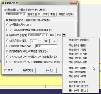 画面4は「検索範囲の設定」ダイアログ。ここでは画面2〜3で指定したレース・馬を、どの期間で検索するかを設定する。「検索開始日」には検索当日がデフォルトでセットされており、今回はラジオボタンで「検索終了日指定」を選択し、プルダウンメニューから[開始日から1年間]を指定している。