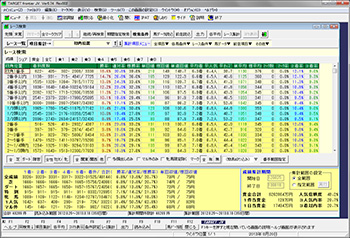 すると別ウインドウが開き、先のデータから「初角1番手」の馬のみが抽出されたレース一覧画面が表示される。ここで、画面5と同様にプルダウンメニューを開いて、右から2列目にある[前走初角位置]を選択する(画面9)。この段階では「前走成績を読み込んで下さい」という画面になるが、ここで画面上部の[前走読込]ボタン、または[Shift+F11]キーを押すと、画面10の前走初角位置別の集計結果が表示される。